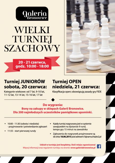 W weekend 20 i 21 czerwca Galeria Bronowice stanie si dwudniow aren krlewskich potyczek szachowych, rozgrywanych w rnych kategoriach wiekowych. Wsplnie z Maopolskim Zwizkiem Szachowym najmodsze krakowskie centrum handlowe zaprasza na Wielki Turniej Szachowy. Nagrody dla zwycizcw to prawie 5 tys. zotych. Termin zgosze upywa 18 czerwca.
