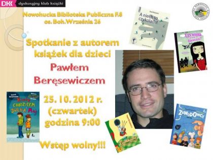 Nowohucka Biblioteka Publiczna w Krakowie serdecznie zaprasza do udziału w spotkaniu ze znanym autorem książek dla dzieci, laureatem wielu nagród m.in. Nagrody Literackiej im. Kornela Makuszyńskiego Pawłem Beręsewiczem,