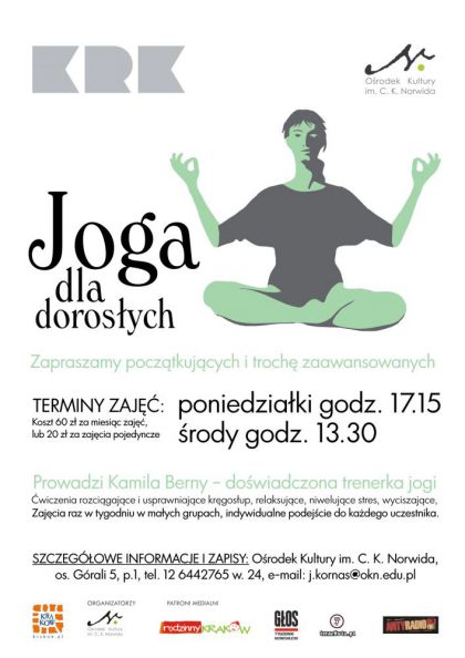 Zapraszamy na zajcia jogi dla pocztkujcych i troch zaawansowanych. Proponujemy wiczenia rozcigajce i usprawniajce krgosup, relaksujce, niwelujce stres, wyciszajce. Regularne wiczenia pomagaj zachowa zdrowie i wewntrzn harmoni.