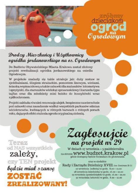 Hura!! Projekt rewitalizacji ogrdka jordanowskiego na Ogrodowym w Nowej Hucie przeszed pozytywnie weryfikacj do Budetu Obywatelskiego (na licie projektw do gosowania, w Dzielnicy XVIII Nowa Huta wylosowa szczliwe, ostatnie - 29-te miejsce :-) ).