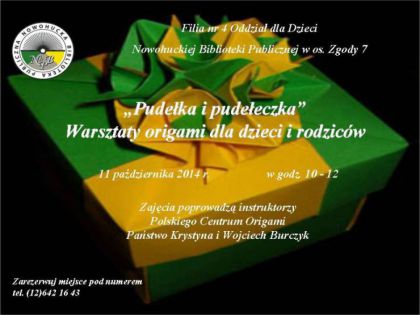 pn. wiat pudeek i pudeeczek w cyklu : Spotkajmy si w bibliotece. Instruktorzy Polskiego Centrum Origami Krystyna i Wojciech Burczyk poprowadz Ci krok po kroku i naucz skadania z papieru ciekawych modeli pudeek. Dziki origami rozwiniesz zdolnoci manualne, wyobrani przestrzenn, cierpliwo, wraliwo i koncentracj! Biblioteka zapewnia materiay. Prosimy o zapis(...) ... więcej » |
