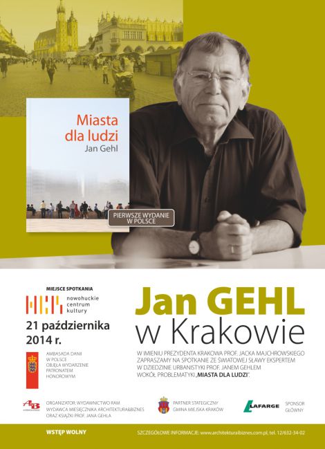 Zapraszamy serdecznie 21 padziernika 2014 r. w NCK Krakw, godz. 18.30 na spotkanie z Profesorem Janem Gehlem, wybitnym duskim architektem i urbanist, propagatorem koncepcji humanistycznego rozwoju miast i autorem projektw zmian w przestrzeni miejskiej m.in. Nowego Jorku i Moskwy.