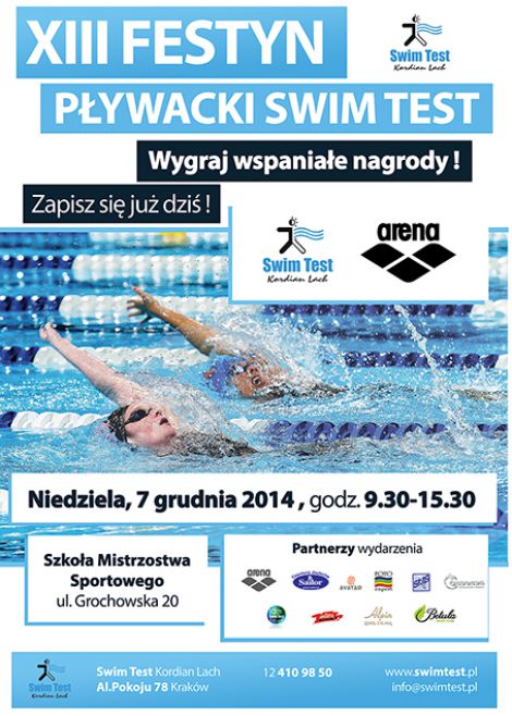 XIII Festyn Pywacki przed nami! Ju w niedziel 7 grudnia odbd si kolejne zawody pywackie Swim Test. Zapraszamy zarwno dzieci, jak i modzie oraz dorosych. Poszukamy najlepszych! Ju teraz zapisz si na turniej i zawalcz o fantastyczne nagrody.