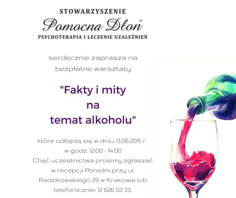 Stowarzyszenie Pomocna Do serdecznie zaprasza na bezpatne warsztaty: "Fakty i mity na temat alkoholu". Spotkanie odbdzie si w sobot 13 czerwca w godz. 12.00 - 14.00 w Poradni na ul. Radzikowskiego 29 w Krakowie.