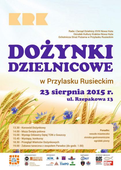 Tradycj s obchodzone w caym kraju, kocem sierpnia kadego roku wita plonw. Podtrzymujc ten zwyczaj, Rada i Zarzd Dzielnicy XVIII Nowa Huta, Orodek Kultury Krakw-Nowa Huta oraz Ochotnicza Stra Poarna w Przylasku Rusieckim zapraszaj na tegoroczne Doynki Dzielnicowe, ktre odbd si w niedziel 23 sierpnia w Przylasku Rusieckim (ul. Rzepakowa 13). W nowohuckich osiedlach wci wielu mieszkacw posiada swoje wasne pola i zajmuje s(...)  ... więcej »