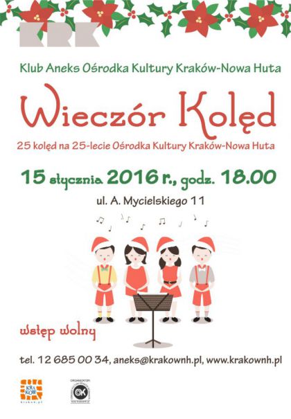 | Koldy piewane s w Polsce powszechnie w okresie Boego Narodzenia. Dlatego co roku w tym czasie spotykamy si w Klubie Aneks Orodka Kultury Krakw-Nowa Huta (ul. A. Mycielskiego 11), by wsplnie podtrzymywa ten pikny zwyczaj. Wspania atmosfer podczas wieczoru kold tworz przychodzce cae rodziny: babcie, dziadkowie, rodzice oraz dzieci, dziki czemu moliwa jest integracja midzypokoleniowa. W tym roku, 15 stycznia o godz. 18.00 uczest(...) ... więcej » |