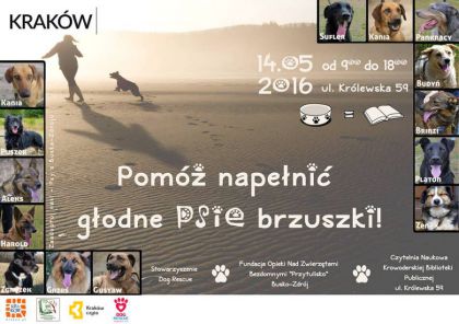 14 maja 2016 w godzinach 9:00 do 18:00 Czytelnia naukowa Krowoderskiej Biblioteki Publicznej wsplnie z Fundacj Opieki Nad Zwierztami Bezdomnymi "Przytulisko" w Busku-Zdroju oraz ze Stowarzyszeniem Dog Rescue zapraszaj na akcj: "Pom napeni godne psie brzuszki, w zamian dostaniesz ksik do poduszki!"