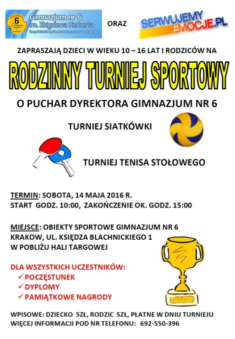 Ju 14 maja w sobot SerwujemyEmocje razem z krakowskim Gimnazjum nr 6 zapraszaj na Rodzinny Turniej Sportowy dla dzieci w wieku podstawwka/gimnazjum oraz ich rodzicw!