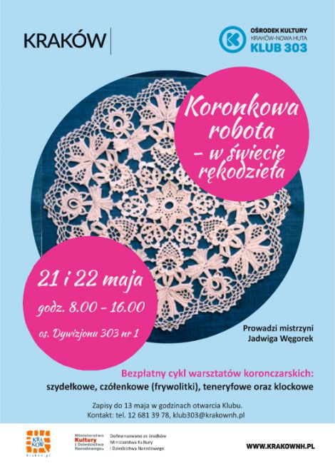 | Jak wyglda koronka szydekowa? A jak czenkowa? Czy koronki teneryfowe trudno wykona? Jak zrobi koronki klockowe? Jeli chcesz znale odpowied na te pytania przyjd 21 lub 22 maja do Klubu 303 Orodka Kultury Krakw-Nowa Huta (os. Dywizjonu 303 nr 1) i we udzia w bezpatnych warsztatach koronczarskich ktre potrwaj od godz. 8:00 do 16:00. Warsztaty poprowadzi mistrzyni koronek Pani Jadwiga Wgorek, ktra swoje wizje artystyczne przelewa(...) ... więcej » |