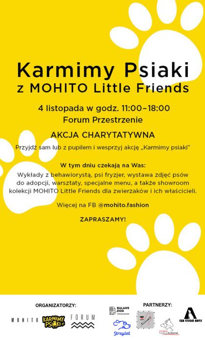 W sobot 4 listopada kady mieszkaniec Krakowa bdzie mia okazj spdzi przyjemnie czas i jednoczenie pomc porzuconym zwierzakom! Wanie wtedy w Forum Przestrzenie odbdzie si wydarzenie Karmimy Psiaki z mark MOHITO. Na uczestnikw czeka wiele atrakcji, m.in. bezpatne zajcia z psim behawioryst, warsztaty robienia zabawek dla zwierzakw czy showroom z ubraniami dla psw i ich wa(...) ... więcej » |