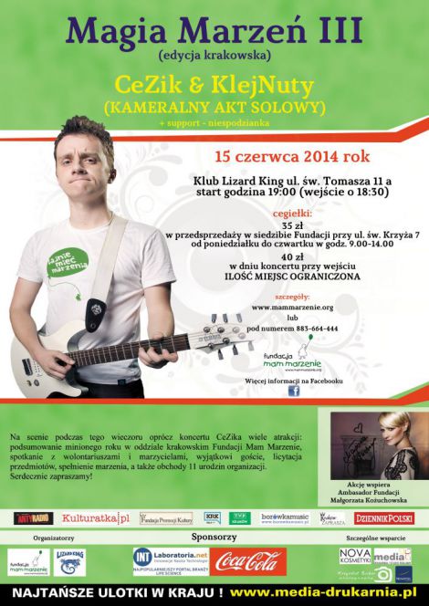 Ju po raz trzeci Ambasador Fundacji Mam Marzenie Magorzata Kouchowska oraz wolontariusze serdecznie zapraszaj wszystkich na koncert charytatywny Magia Marze III edycja krakowska, ktry odbdzie si 15 czerwca 2014 roku o godzinie 19:00 w klubie Lizard King w Krakowie, przy ul. w. Tomasza 11a.