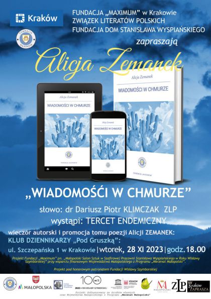 Fundacja "Maximum", Krakowski Oddział Związku Literatów Polskich, Małopolski Salon Sztuk zapraszają na wieczór autorski Alicji Zemanek i promocję najnowszego tomu poezji pt. „Wiadomości z chmur”. 28 listopada 2023 r. w Klubie Dziennikarzy „Pod Gruszką” przy ul. Szczepańska 1 o godz. 18.00 wystąpi Poetka wraz z wydawcą oraz krytykiem literackim dr. Dariuszem Piotrem Klimczakiem. Wieczór uświetni „Tercet Endemiczny” z Myślenic prezentujący muzykę kameralną