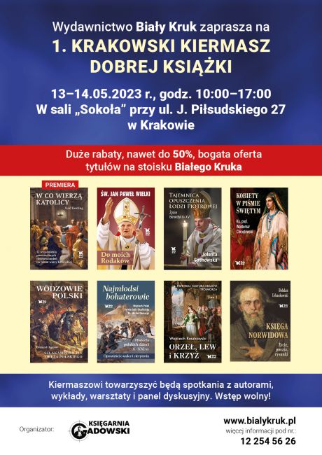 Serdecznie zapraszamy na stoisko Białego Kruka podczas 1. Krakowskiego Kiermaszu Dobrej Książki, który odbędzie się w dniach od 13 do 14 maja 2023 r., w godzinach od 10.00 do 17.00 w sali „Sokoła” przy ul. Marszałka Józefa Piłsudskiego 27.