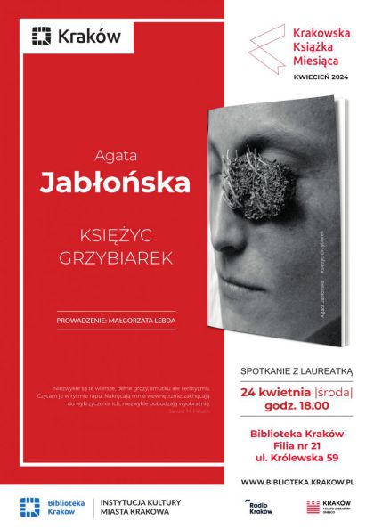 Spotkanie z Agatą Jabłońską – laureatką nagrody Krakowska Książka Miesiąca – i wręczenie nagrody za tomik Księżyc Grzybiarek będący konceptem antyłowieckim. Poetka jest laureatką Wrocławskiej Nagrody Poetyckiej „Silesius” oraz Nagrody im. Kazimiery Iłłakowiczówny, zawodowo związana z Muzeum Narodowym w Krakowie. Rozmowę poprowadzi Małgorzata Lebda.