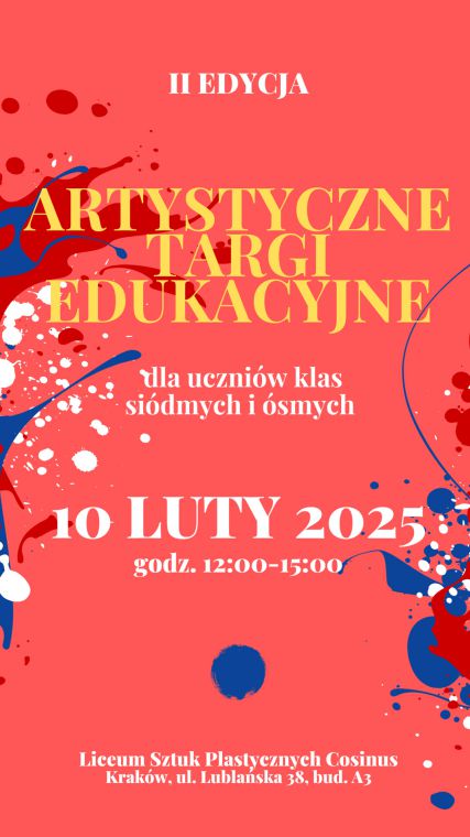 Jesteś uczniem klasy siódmej lub ósmej szkoły podstawowej? Masz zdolności artystyczno-plastyczne lub manualne? Jesteś osobą kreatywną i pragniesz tę cechę rozwijać w dalszej edukacji? Jeśli tak ta propozycja jest właśnie dla ciebie! Już 10 lutego 2025 roku (poniedziałek) w siedzibie Liceum Sztuk Plastycznych Cosinus przy ulicy Lublańskiej 38, bud. A3, w godzinach 12.00-15.00 odbędą się II Artystyczne Targi Edukacyjne, podczas których swą ofertę edukacyjną związaną z kształceniem artystycznym, kreatywnym technicznym i branżowym pokażą krakowskie szkoły średnie.
