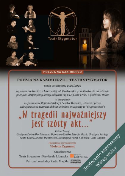 W najbliższą sobotę tj. 29 marca 2025 roku odbędzie się wieczór w którym wezmą udział poeci i aktorzy z Klubu Artystyczno-Literackiego Teatru Stygmator. Przeczytają oni wiersze i prozę związane z teatrem. Odbędzie się również mini recital barda Marcina Guzika (po raz pierwszy w Teatrze Stygmator). Uczestnicy programu wspomną również Zofię Kalińską i Leszka Mądzika.