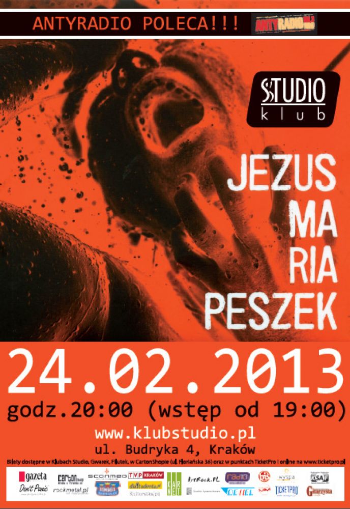Jesienna trasa promujšca płytę Jezus Maria Peszek spotkała się z entuzjastycznym odbiorem. Kilkanacie koncertów zobaczyło ponad 10 tysięcy ludzi. Wiedzielimy, że nowy materiał ma w sobie fantastyczny potencjał, ale okazało się, że Jezus to koncertowa petarda! To niesamowite uczucie, gdy stoisz na scenie i widzisz takie żywiołowe reakcje, kiedy ludzie piewajš głoniej niż ty. Taki emocjonalny odbiór publicznoci pokazuje, że to co robię ma sens. Jeli otrzymuję tak olbrzymi odzew z tamtej strony, to wiem, że warto było się narażać, znosić ataki i ić własnš drogš podsumowuje artystka. Żeby w pełni dowiadczyć emocji jakie wyzwala płyta, która w Polsce wywołała burzę i o której sama Maria mówi, że jest dla niej najważniejsza, trzeba być na koncercie a koncert w Krakowie już 24 lutego!