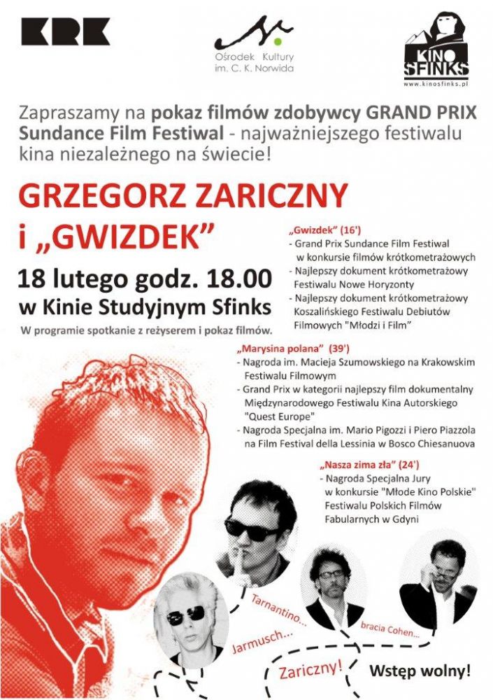 Grzegorz Zariczny, krakowski reżyser, współpracujšcy z Kinem Studyjnym Sfinks, współtwórca Nowohuckiej Kroniki Filmowej, którego film "Gwizdek" zwyciężył podczas tegorocznego Festiwalu w Sundance w kategorii filmów krótkometrażowych.
