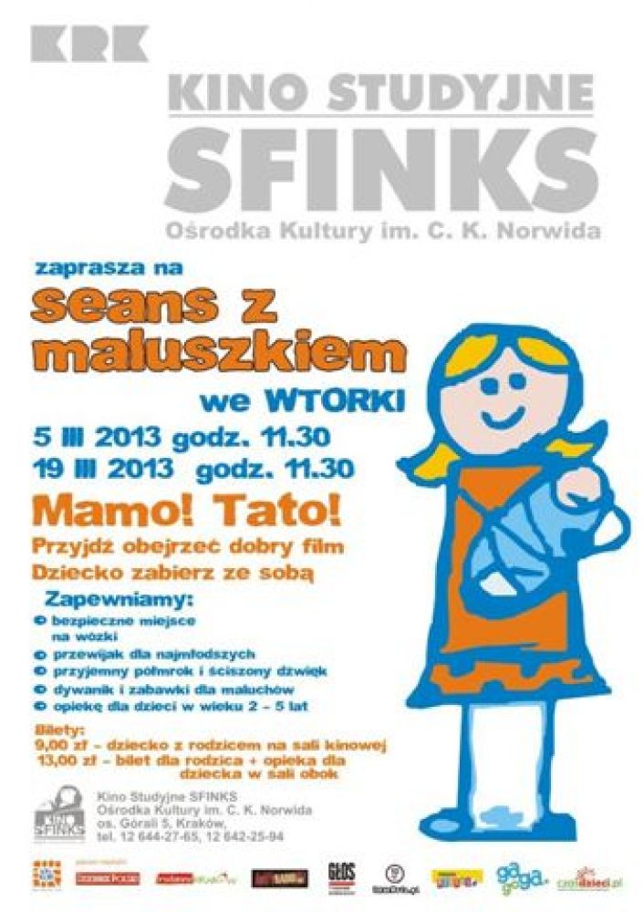 Podczas cyklu SEANS Z MALUSZKIEM proponujemy wspólne, dopołudniowe projekcje dobrych filmów, na które zapraszamy rodziców wraz z dziećmi gwarantujšc szczególnie dobrany repertuar (kino o wysokich walorach zdjęciowych i muzycznych, bez scen przemocy), zaplecze organizacyjne przyjazne rodzicom (przewijak dla najmłodszych, bezpieczne miejsce na wózki) a także przyjemny półmrok na sali kinowej i ciszony dwięk dla tych rodziców, którzy zechcš oglšdnšć film w towarzystwie swojej pociechy. Spotkania odbywajš się w Kinie Sfinks dwa razy w miesišcu, w godzinach dopołudniowych.