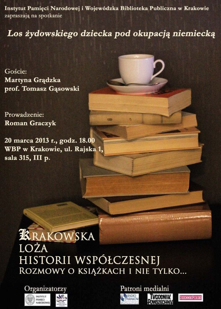 Instytut Pamięci Narodowej oraz Wojewódzka Biblioteka Publiczna w Krakowie zapraszajš na spotkanie Los żydowskiego dziecka pod okupacjš niemieckš. W dyskusji wemie udział Martyna Gršdzka oraz prof. Tomasz Gšsowski. Spotkanie poprowadzi Roman Graczyk.