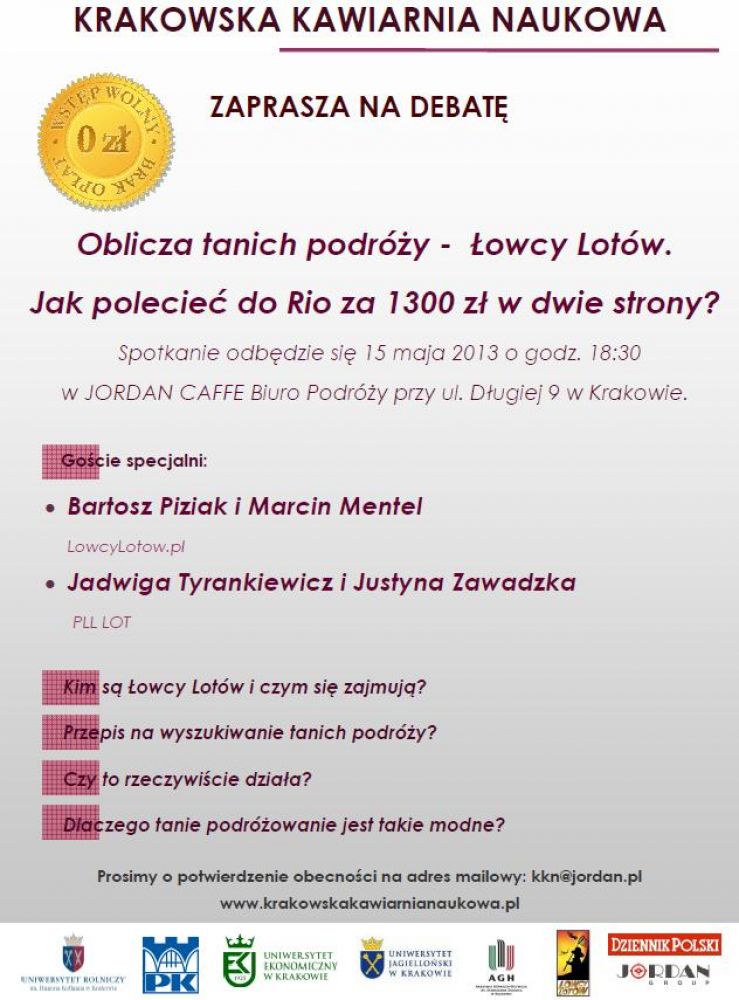 Krakowska Kawiarnia Naukowa zaprasza na debatę: Oblicza tanich podróży - Łowcy Lotów. Jak polecieć do Rio za 1300 zł w dwie strony?