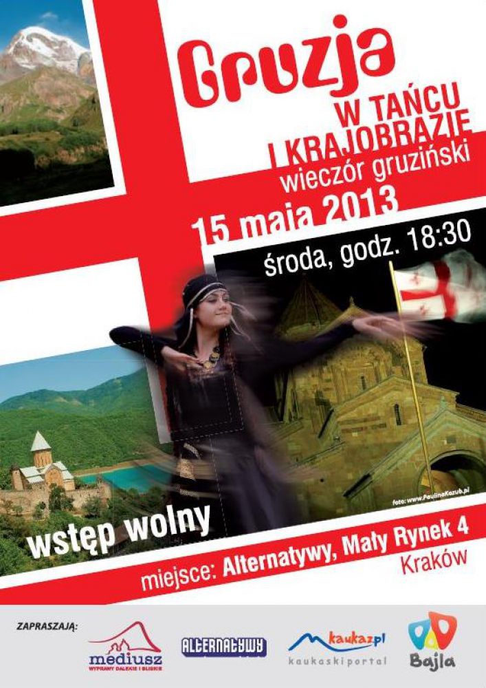 Podczas spotkania w Klubie Alternatywy chcemy podzielić się naszš pasjš. Mediusz pokaże zdjęcia robione w Gruzji podczas kolejnych wyjazdów i opowie historie z nimi zwišzane, a Bajla zabierze Was w tanecznš podróż w tamte rejony.
