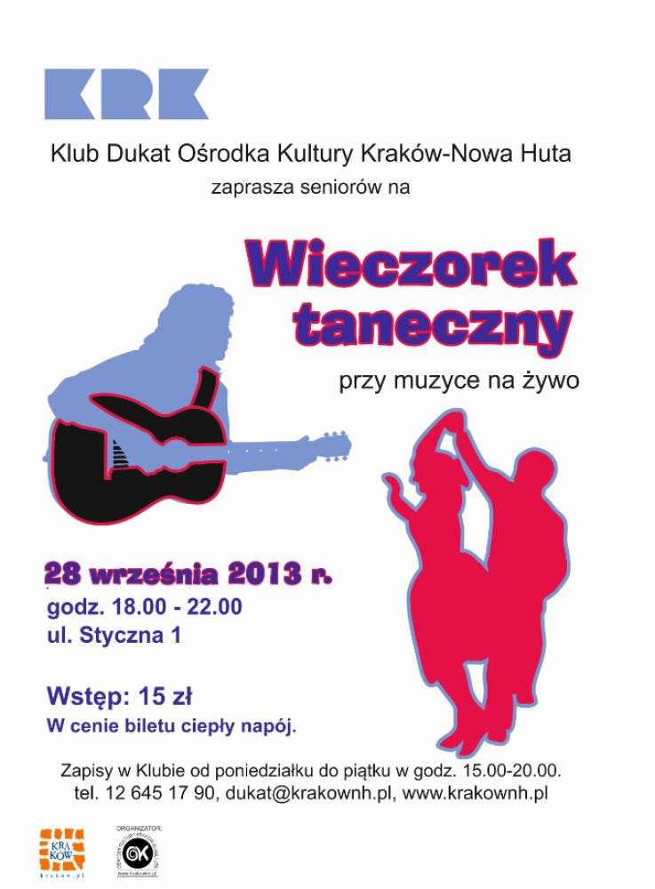 Klub Dukat Oœrodka Kultury Kraków-Nowa Huta (ul. Styczna 1) zaprasza na wieczorek taneczny przy muzyce na żywo w wykonaniu zespołu Janki. Wieczorek odbędzie się 28 wrzeœnia w godz. 18.00-22.00. W czasie imprezy odbędzie się wybór królewskiej pary wieczorku. Przewidziany jest również walc kotylionowy. Zgłoszenia w Klubie Dukat (tel. 12 645 17 90) od poniedziałku do poniedziałku do pištku w godz. 15.00-20.00.