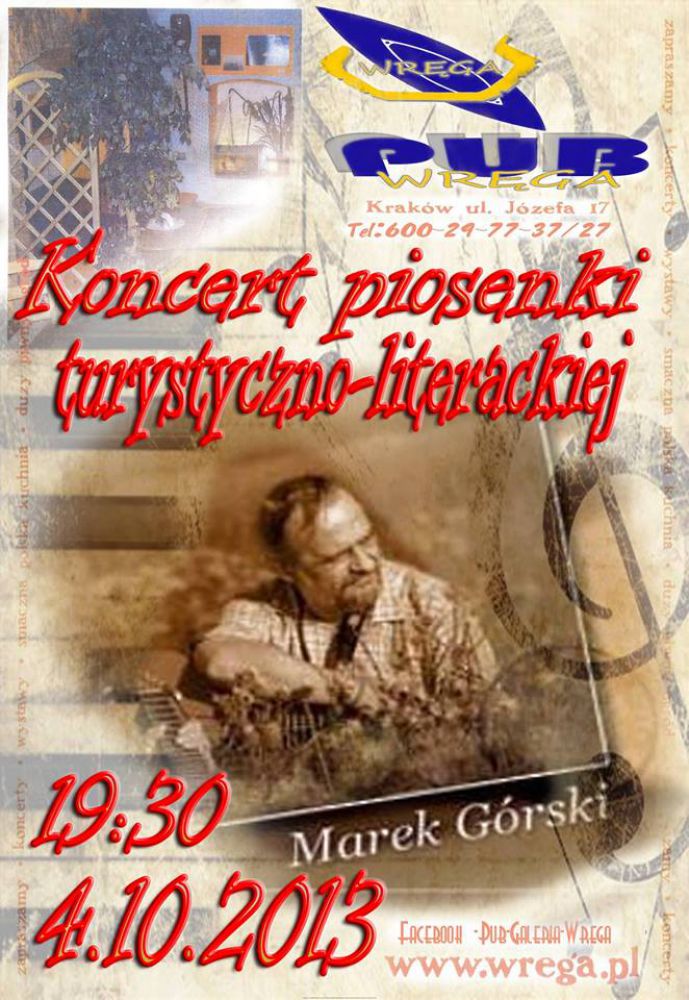 Pub Galeria WRGA zaprasza serdecznie na pitkowy koncert piosenki turystyczno-literackiej.Wieczr uwietni nam legenda wielu przegldw i festiwali sam Marek Grski.