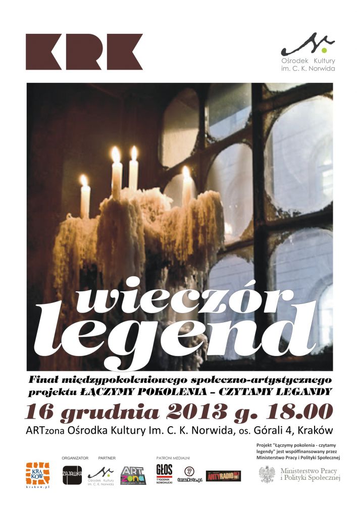 Serdecznie zapraszamy na WIECZÓR LEGEND będšcy finałem międzypokoleniowego społeczno-artystycznego projektu ŁĽCZYMY POKOLENIA – CZYTAMY LEGENDY. Spotkanie odbędzie się w poniedziałek 16 grudnia 2013r. o godz. 18.00
