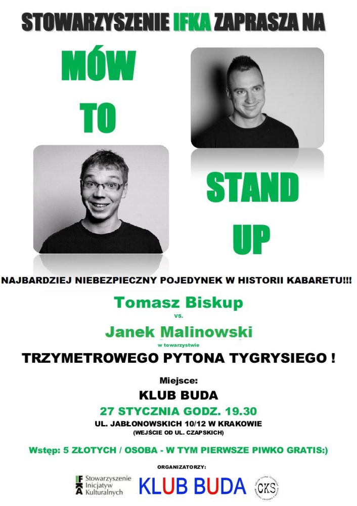 Stowarzyszenie Inicjatyw Kulturalnych IFKA zaprasza na PIEKIELNIE DOBRY STAND UP w KLUBIE BUDA 27 stycznia o godzinie 20.00. Wystšpi Tomek Biskup i Janek Malinowski.
