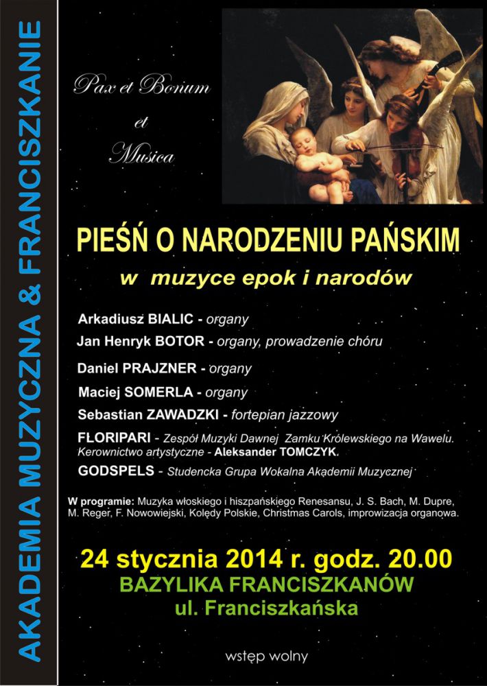Akademia Muzyczna w Krakowie oraz Franciszkanie z Franciszkańskiej w Krakowie zapraszajš na koncert "Pień o Narodzeniu Pańskim w muzyce epok i narodów", który odbędzie się w pištek, 24 stycznia o godzinie 20:00 w Bazylice Franciszkanów w Krakowie. Wstęp na koncert wolny! Serdecznie zapraszamy!