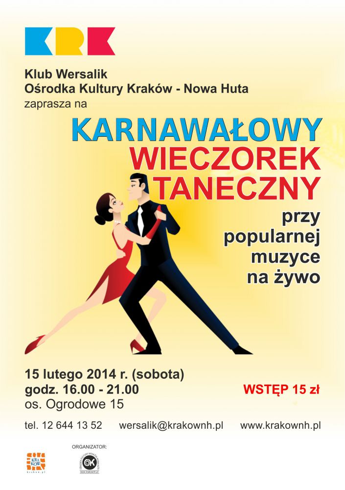 Zapraszamy na wieczorek taneczny przy muzyce popularnej na żywo do Klubu Wersalik Oœrodka Kultury Kraków-Nowa Huta (os. Ogrodowe 15).