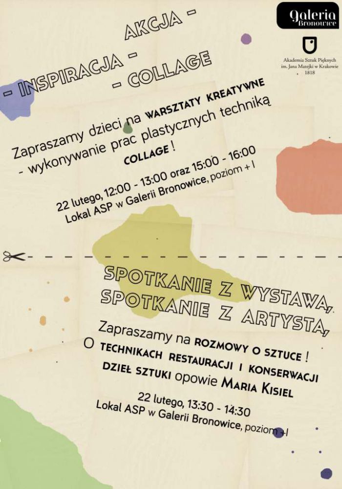 Spotkania ze sztukš rozpocznš się zajęciami dla dzieci pt. Akcja-inspiracja. Najmłodsi zapoznajš się z technikš artystycznš collage, czyli formowaniem kompozycji z różnego rodzaju materiałów i tworzyw. Niesamowita przygoda z dziełami sztuki europejskiej wcišgnie dzieci do magicznego wiata każdy będzie mógł malować, rysować, rzebić i tworzyć. - Taka podróż w wyobranię jest wietnym sposobem zdobywania wiedzy i gwarancjš szerokiego rozwoju poprzez zabawę. Najmłodsi będš więc mogli rozwinšć swoje zdolnoci, nauczyć się ekspresji i odkryć własny potencjał twórczy mówi Natalia Buchta, wykładowca z krakowskiej ASP, autorka wielu warsztatów opartych na treningu twórczoci i rozwoju wyobrani.