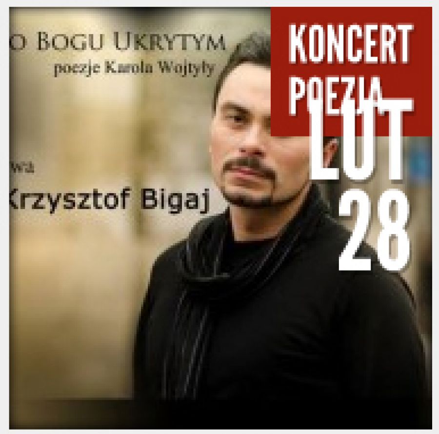 Oczekujšc na kanonizację bł. Jana Pawła II artyœci przeprowadzš was po najważniejszych tematach poezji Karola Wojtyły: miłoœć, pokora, œmierć, zmartwychwstanie, Eucharystia. Koncert promuje płytę ze œpiewanš poezjš Karola Wojtyły, pt. „Pieœni o Bogu Ukrytym”. Twórcš albumu i wykonawcš programu jest Krzysztof Bigaj, który nie tylko zaœpiewa wiersze, ale również przedstawi fragmenty utworów dramatycznych Wojtyły, takich jak „Brat naszego Boga” czy „Przed sklepem Jubilera”. Autor pragnie w ten sposób ukazać mniej znane, artystyczne oblicze bł. Jana Pawła II.