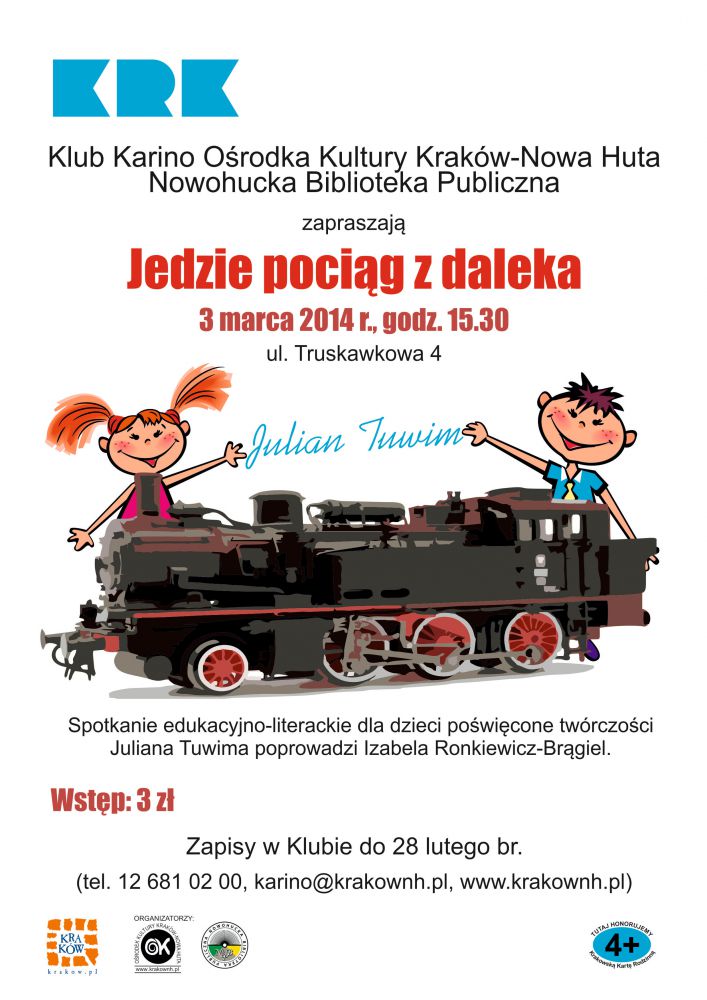 Lokomotywa, Ptasie Radio, Rzepka - to wiersze Juliana Tuwima, ktre zna kady z nas. Teksty poety to nie tylko genialne wiersze do czytania, ale take utwory dajce moliwo niekonwencjonalnych interpretacji. Szans niecodziennego odczytania dzie Tuwima bd miay dzieci podczas spotkania edukacyjno-literackiego, na ktre zapraszaj: Klub Karino Orodka Kultury Krakw-Nowa Huta i Nowohucka Biblioteka Publiczna.