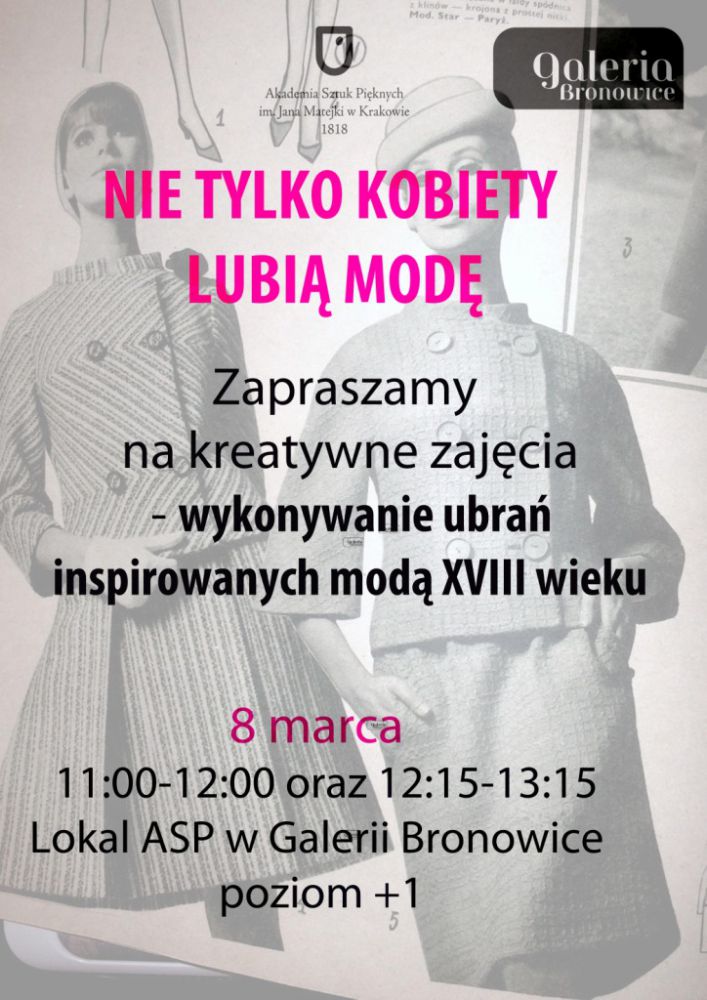 Zajęcia „Nie tylko kobiety lubiš modę” odbędš się w sobotę w godz. 11:00-12:00 oraz 12:15-13:15, w lokalu „Akademia w Bronowicach” na poziomie +1 galerii.