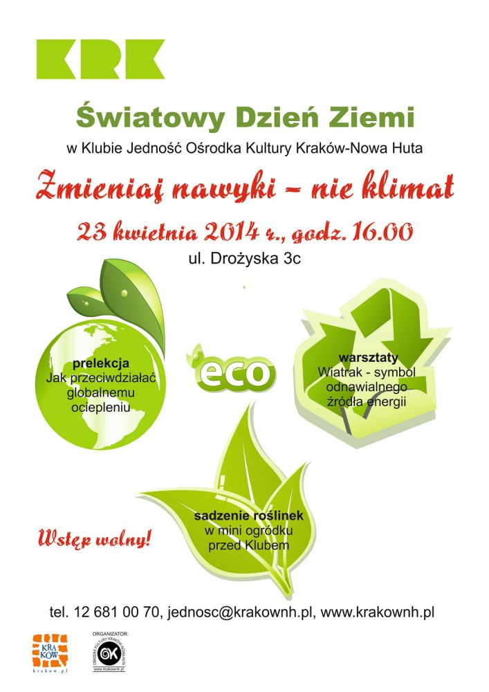 Zmieniaj nawyki, nie klimat - pod takim hasłem odbędzie się impreza z okazji największego ekologicznego œwięta œwiata, które obchodzone jest w 192 krajach. Klub Jednoœć Oœrodka Kultury Kraków-Nowa Huta (ul. Drożyska 3 c) jak co roku włšcza się w obchody Dnia Ziemi poprzez organizację warsztatów, na których z materiałów wtórnych i naturalnych wykonywany będzie wiatrak – odnawialne Ÿródło energii. Nie zabraknie również krótkiej prelekcji na temat zmian klimatu i przeciwdziałania globalnemu ociepleniu, a przed Klubem powstanie mini ogródek, gdzie przybyli na imprezę posadzš różne roœliny.