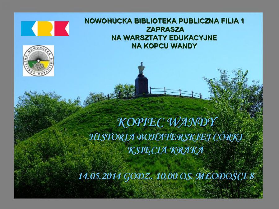 Warsztaty edukacyjne odbędš się w ramach Tygodnia Bibliotek - Czytanie łšczy pokolenia na Kopcu Wandy. Podczas warsztatów słuchacze poznajš historię Kopca Wandy i legendę o bohaterskiej córce księcia Kraka, zamieszczonš w zbiorze legend krakowskich, autorstwa Jana Adamczewskiego. Uczestnicy spotkania zobaczš również marmurowy pomnik projektu Jana Matejki, którym zwieńczony jest Kopiec oraz będš podziwiać widoki z Kopca Wandy.