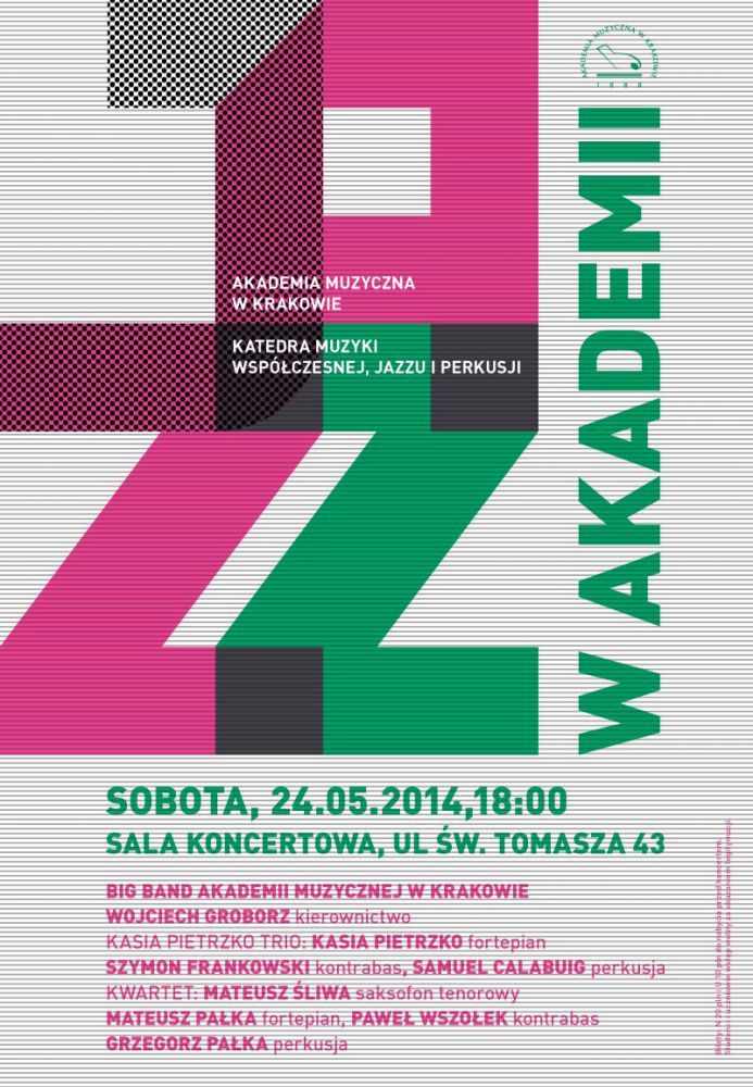 W sobotę 24 maja o godz. 18:00 w Sali koncertowej przy ul. œw. Tomasza 43 wystšpi Big Band Akademii Muzycznej pod kierownictwem Wojciecha Groborza oraz Kasia Pietrzko Trio w składzie: Kasia Pietrzko - fortepian, Szymon Frankowski – kontrabas, Samuel Calabuig – perkusjab Grzegorz Pałka - perkusja i Kwartet w składzie: Mateusz Œliwa - saksofon tenorowy, Mateusz Pałka – fortepian oraz Paweł Wszołek - kontrabas.