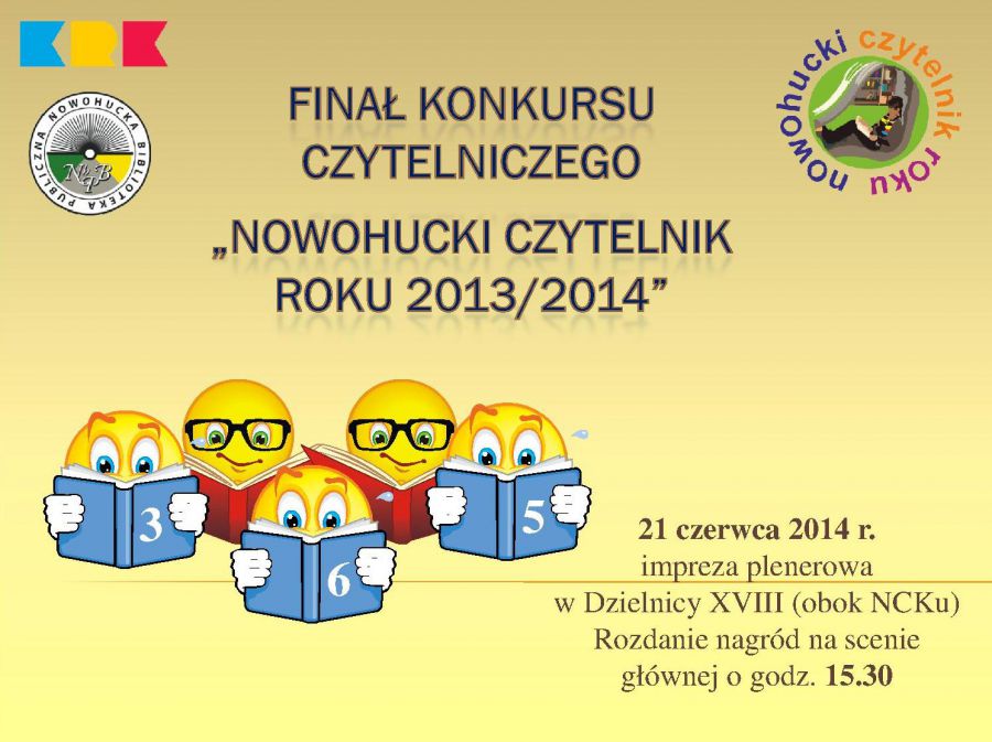 O godz. 15.30 na scenie głównej nastšpi ogłoszenie wyników 11. edycji konkursu czytelniczego. Uczestnicy pikniku dowiedzš się kto zasłużył na tytuł Nowohuckiego Czytelnika Roku 2013/14. Serdecznie zapraszamy wszystkich czytelników Nowohuckiej Biblioteki Publicznej i mieszkańców Krakowa.
