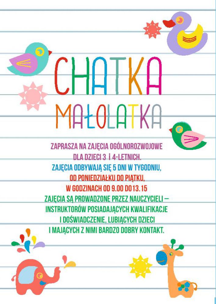 Zapraszamy na zajęcia ogólnorozwojowe dla dzieci 3- i 4-letnich. Zajęcia odbywajš się 5 dni w tygodniu, od poniedziałku do pištku, w godzinach od 9.00 do13.15 i sš prowadzone przez nauczycieli instruktorów posiadajšcych kwalifikacje, dowiadczenie i majšcych bardzo dobry kontakt z dziećmi.