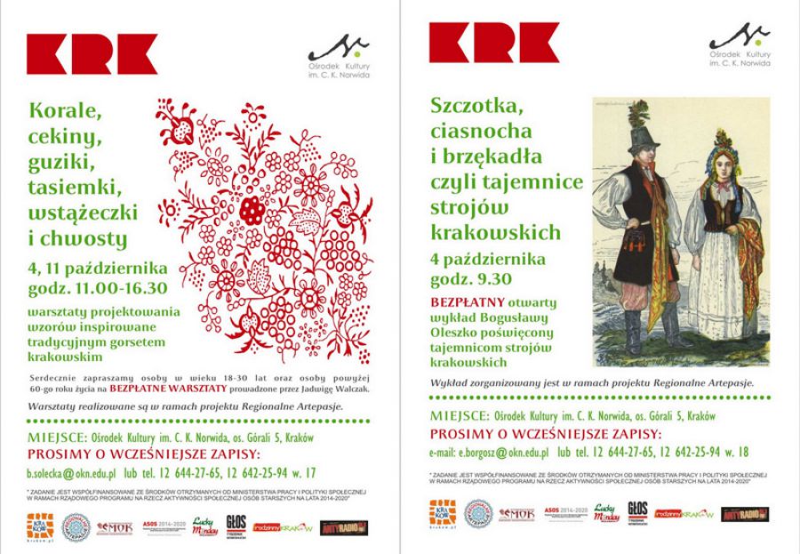 Serdecznie zapraszamy pasjonatów tradycji i stroju ludowego oraz rękodzieła i inspiracji nimi, na bezpłatne: wykład i dwudniowe warsztaty, które odbędš się w ramach Regionalnych Artepasji w Orodku Kultury im. C.K. Norwida w Krakowie ( os. Górali 5). W wykładzie mogš wzišć udział osoby w każdym wieku. Warsztaty kierowane sš do osób między 18-tym a 30-tym rokiem życia oraz seniorów po 60-tce.