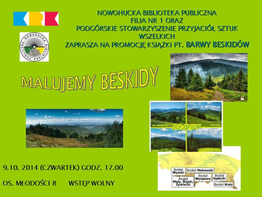 Biblioteka zaprasza na promocj najnowszej ksiki wydanej przez Podgrskie Stowarzyszenie Przyjaci Sztuk Wszelkich pt. Barwy Beskidw. Ksika prezentuje pikne krajobrazy Beskidw w rnych porach roku. Autorami prac s czonkowie Podgrskiego Stowarzyszenia Przyjaci Sztuk Wszelkich.