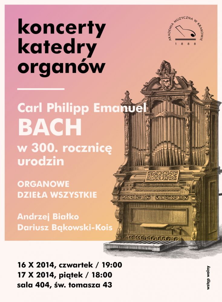 W ramach obchodw roku Carla Philippa Emanuela Bacha (1714-1788) profesorowie Andrzej Biako i Dariusz Bkowski-Kois z Katedry Organw Akademii Muzycznej w Krakowie wykonaj, w ramach czterech precitali, organowe dziea wszystkie Kompozytora. Serdecznie zapraszamy na dwa koncerty organowe do sali 404: w czwartek 16 padziernika 2014 na godz. 19.00 oraz w pitek 17 padziernika 2014 na godz. 18.00. WSTP WOLNY!