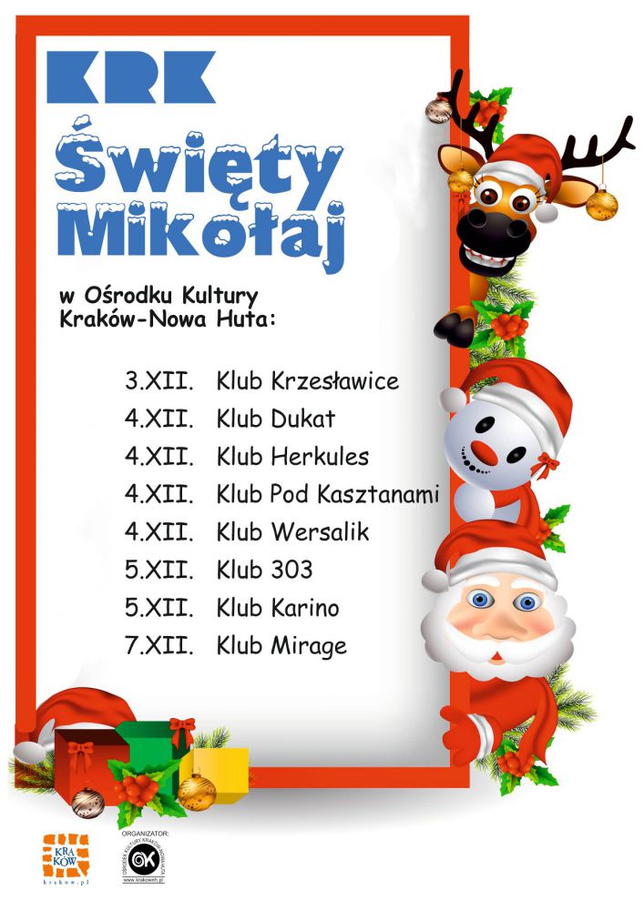 Na wizytę więtego Mikołaja czekajš również w Klubach Orodka Kultury Kraków-Nowa Huta. Już 3 grudnia w Klubie Krzesławice dzieci i młodzież wspólnie poszukiwać będš w. Mikołaja. Przeszkadzać im w tym będzie figlarny diabełek, który poprzestawia wszystkie drogowskazy, po to by Mikołaj nie mógł trafić na miejsce spotkania. Na szczęcie dzieci będš mogły liczyć na pomoc aniołka, który wemie sprawy w swoje ręce. 4 grudnia odbędš się aż cztery spotkania ze więtym Mikołajem. W programie spotkania w Klubie Dukat przewidziano liczne zabawy i zadania, prezenty i mały poczęstunek. W Klubie Wersalik na dzieci w wieku 2-8 lat czekać będš zabawy ze nieżynkami i podarunki. Do wspólnego tropienia ladów Mikołaja zaprosi dzieci Klub Herkules. więty odwiedzi także Klub Pod Kasztanami, w którym to dzieci dowiedzš się, jakie imię nosi Mikołaj w innych krajach. 5 grudnia Mikołaj zagoci w Klubie Karino. Uczestnicy spotkania będš wspólnie ubierać choinkę własnoręcznie wykonanymi ozdobami z bibuły, orzechów i ciasta solnego, będš bawić się przy wištecznym drzewku, a także poszukiwać Mikołaja i nieżynki oraz ukrytych prezentów. W tym samym dniu do Klubu 303 zawita zwariowana mikołajkowa wita, która przygotuje wszystkich uczestników do spotkania ze swoim Szefem. Dzieci nauczš się okrzyków przywołujšcych Mikołaja, odtańczš Mikołajowy Taniec Zwariowaniec, przygotujš wspólny prezent i wreszcie przywołajš oczekiwanego Gocia, który w swych magicznych saniach przywiezie dla wszystkich dzieci prezenty. więty Mikołaj nie opuci szybko Nowej Huty. 7 grudnia w Klubie Mirage odbędzie się spotkanie dla dzieci, które dowiedzš się co trzeba robić, żeby zostać pomocnikiem więtego, a potem poczujš się jak elfy i razem z Mikołajem przygotujš prezenty dla innych maluchów. Na koniec wszystkie dzieci, które w pracowni Mikołaja były grzeczne i pracowite otrzymajš od niego podarunki.