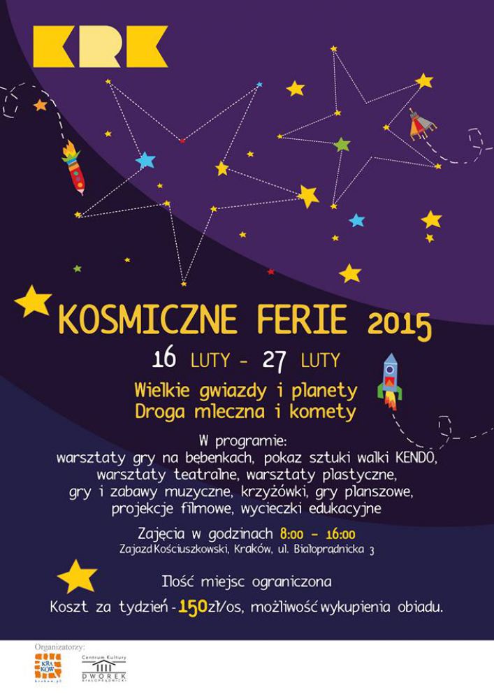Komety zapowiadajš dobre czy złe wydarzenia? Czym różni się meteor od meteorytu? Jak powstały znaki zodiaku? Co się rusza niebo, czy ziemia? Podczas ferii w Dworku Białopršdnickim odpowiemy na wiele kosmicznych pytań! Spadajšce gwiazdy, zaćmienie Słońca, Purpurowy Księżyc wszechwiat kryje wiele tajemnic, a my spróbujemy je odkryć. Poznamy podstawowe zagadnienia nie tylko z dziedziny astronomii, ale i zajmiemy się naukami przyrodniczymi. Warsztaty edukacyjne połšczone zostanš z zajęciami plastycznymi, muzycznymi, grami i zabawami. Nie zabraknie również wycieczek.