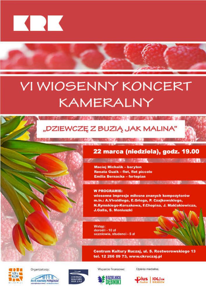 Bilety w cenie 10 zł (doroli), 5 zł (uczniowie, studenci) do nabycia w biurze CK "Ruczaj" od poniedziałku do pištku w godz. 13:00-21:00 lub na 2 godziny przed koncertem.