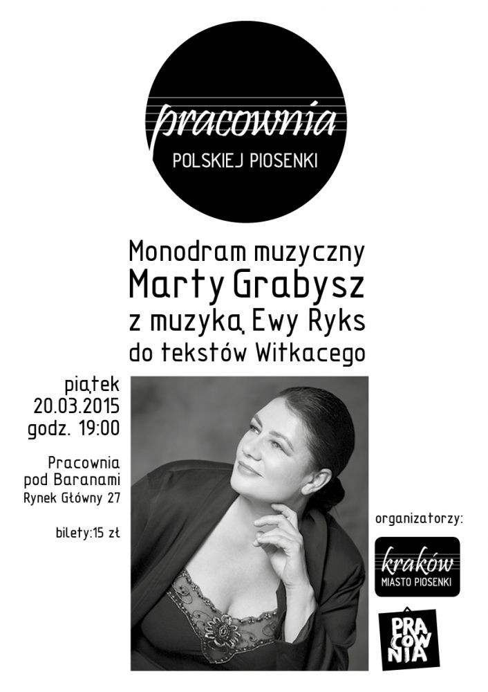 Kraków - Miasto Piosenki serdecznie zaprasza miłoœników twórczoœci Witkacego, ale nie tylko, na monodram muzyczny Marty Grabysz z muzykš Ewy Ryks do tekstów Witkacego.