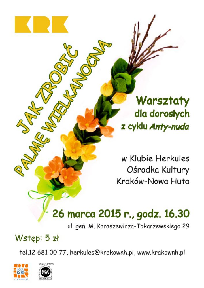 Palma wielkanocna to tradycyjny symbol Niedzieli Palmowej. Możemy zakupić gotowš plamę, lub wykonać jš samodzielnie. Jej wyglšd zależy od naszej fantazji i cierpliwoci. Jeli chcesz spróbować, jak wykonać i ozdobić palmę wielkanocnš, ale nie wiesz jak to zrobić, spróbujemy ci pomóc. Zapraszamy na warsztaty do Klubu Herkules Orodka Kultury Kraków-Nowa Huta (ul. gen. M. Karaszewicza-Tokarzewskiego 29) w ramach cyklu Anty-nuda, które odbędš się 26 marca o godz. 16:30.