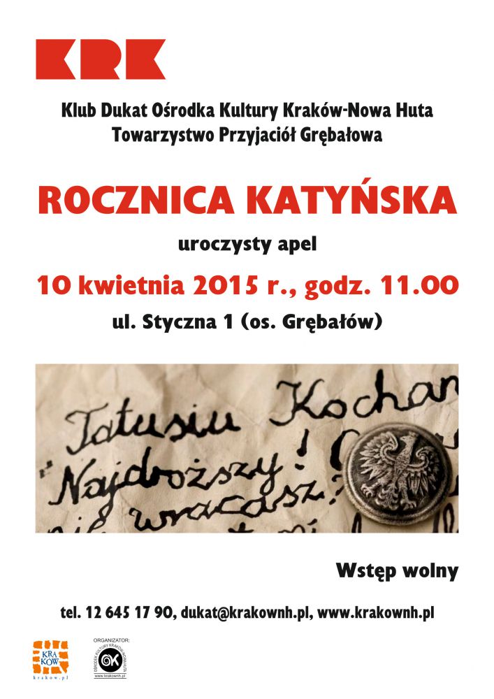 10 kwietnia br. od godz. 11.00 zapraszamy wszystkich mieszkańców Grębałowa i okolic na uroczysty apel poległych, złożenie kwiatów i zapalenie zniczy pod kamieniem katyńskim, który znajduje się na terenie Klubu Dukat Oœrodka Kultury Kraków-Nowa Huta (ul. Styczna 1).